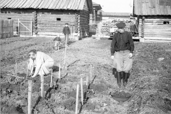 Весна 1959 года, идет посевная на огороде, на заднем плане я и брат Сергей, на переднем плане мама, Мария Дмитриевна (1905—1972) и отец, Степан Андреевич (1899—1978).