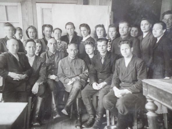 Отец сидит на первом ряду, крайний слева. Управление Заводоуспенской фабрики. 1957 год. Папа проработал главным бухгалтером фабрики с 1953 года по 1959 год.