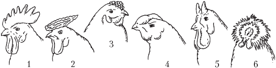 Форма гребней: 1 – листовидный; 2 – розовидный; 3 – стручковидный; 4 – ореховидный; 5 – роговидный; 6 – бабочковидный