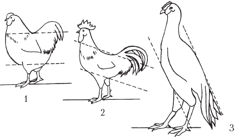 Постав тела кур: 1 – горизонтальный; 2 – наклонный; 3 – выпрямленный (вертикальный)