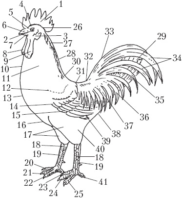 Стати петуха: 1 – гребень; 2 – лицо и глаза; 3 – ушные мочки; 4 – темя; 5 – лоб; 6 и 7 – клюв (надклювье и подклювье); 8 – сережки; 9 и 10 – горло и шея; 11 – грива; 12 – малые кроющие перья; 13 – грудь; 14 и 15 – перья крыла; 16 и 17 – голень; 18 – пятка; 19 – плюсна; 20 – наружный палец; 21 – средний палец; 22 и 23 – внутренний палец; 24 – средний палец; 25 – наружный палец; 26 – затылок; 27 – верхняя часть шеи; 28 – средняя часть шеи; 29 – рулевые перья; 30 – нижняя часть шеи; 31 – верхняя часть спины; 32 – средняя часть спины; 33 – поясница; 34 – большие косицы хвоста; 35 – малые косицы и кроющие перья хвоста; 36 – поясничные перья; 37 – малые кроющие перья хвоста; 38 – маховые перья второго порядка; 39 – маховые перья первого порядка; 40 – хлуп и кочень; 41 – задний палец