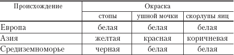 В процессе одомашнивания и разведения кур были созданы разнообразные породы. В настоящее время кур классифицируют по хозяйственных признакам. Исходя из этого, различают: яичный, мясной, мясо-яичный, бойцовый и декоративный типы кур. С учетом разведения и племенного отбора кур породы подразделяют на группы: азиатские, средиземноморские, европейские. Для установления происхождения птицы можно ориентироваться на окраску ног (стопы), ушной мочки, скорлупы яиц (табл. 2).