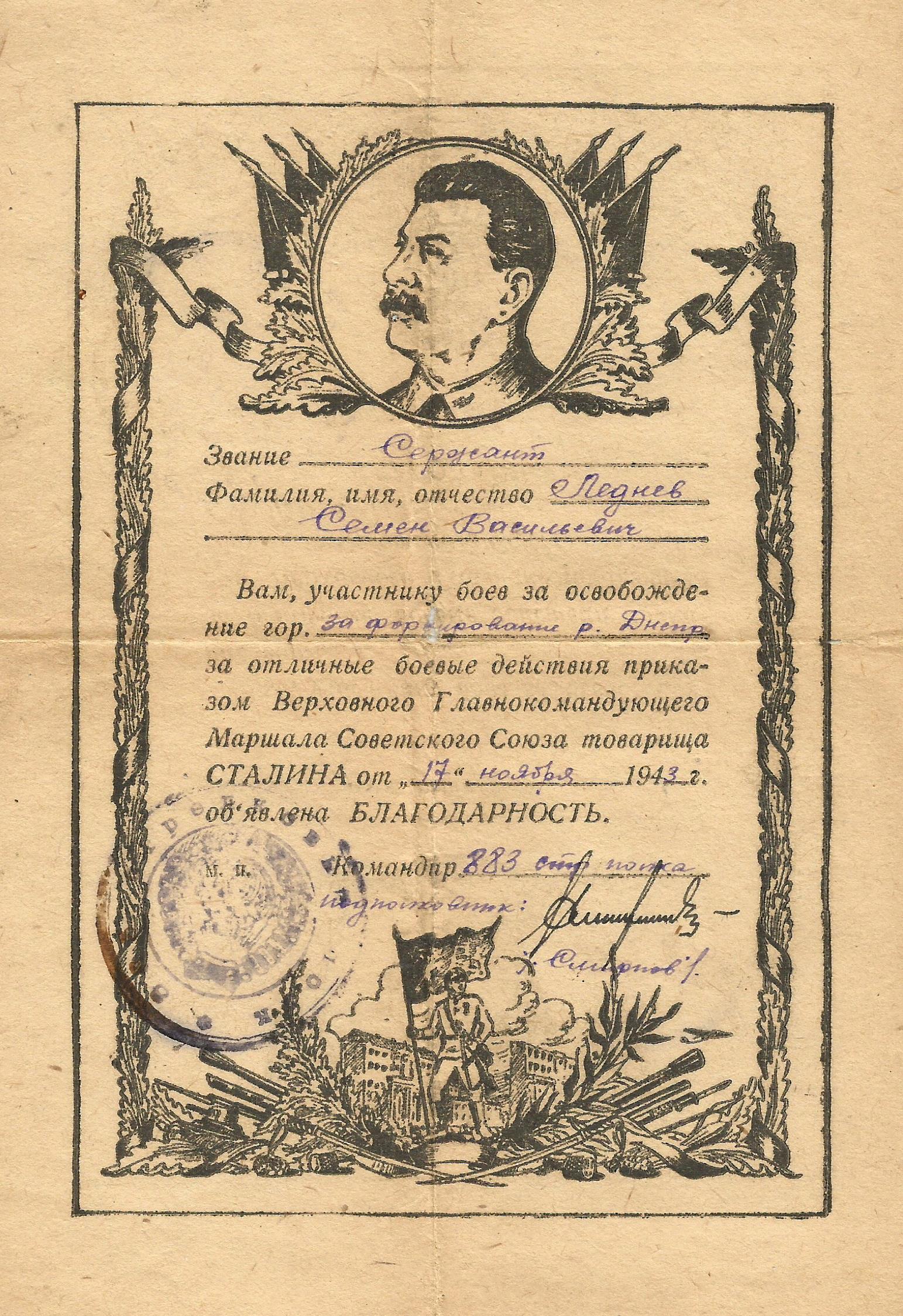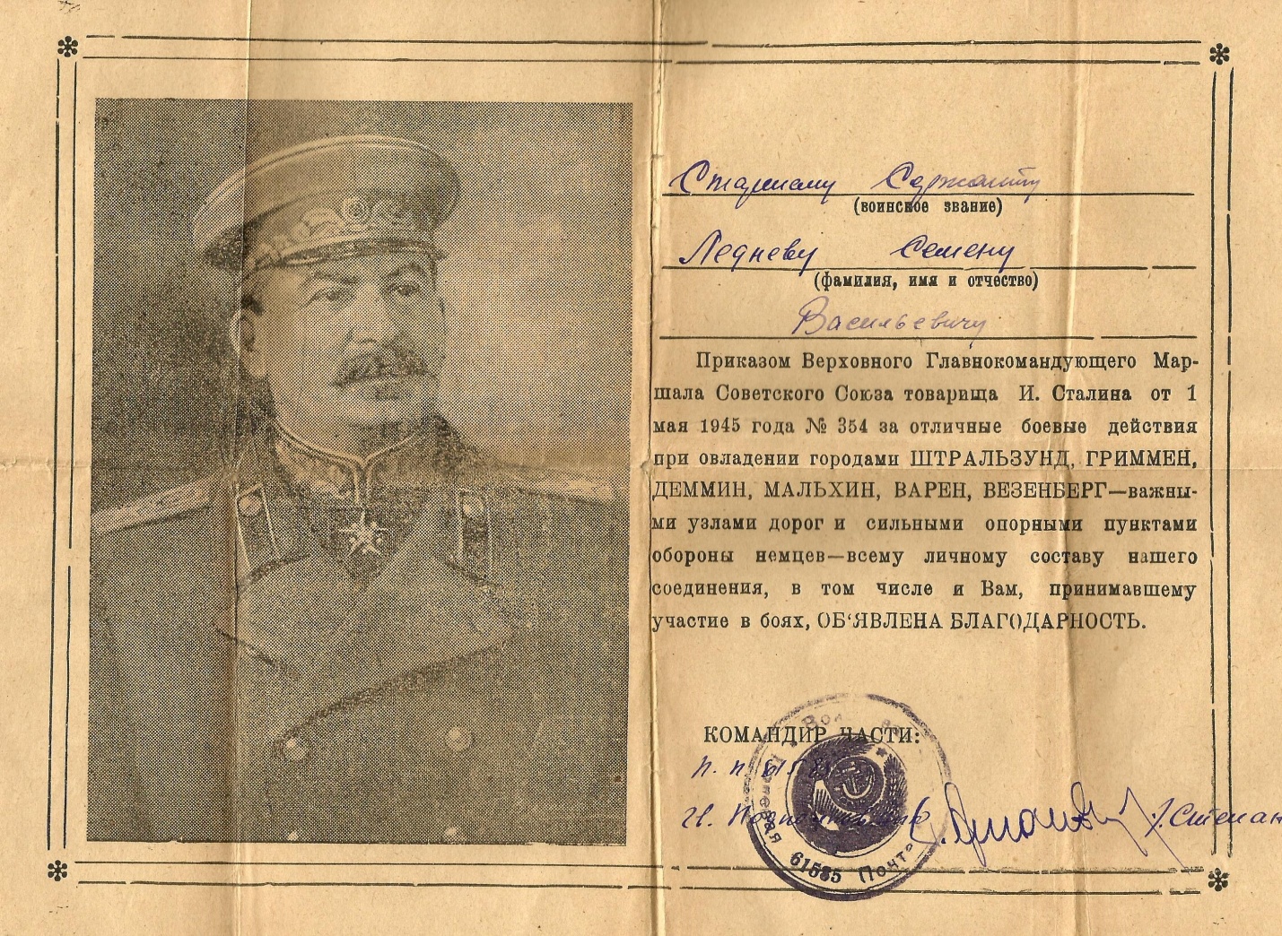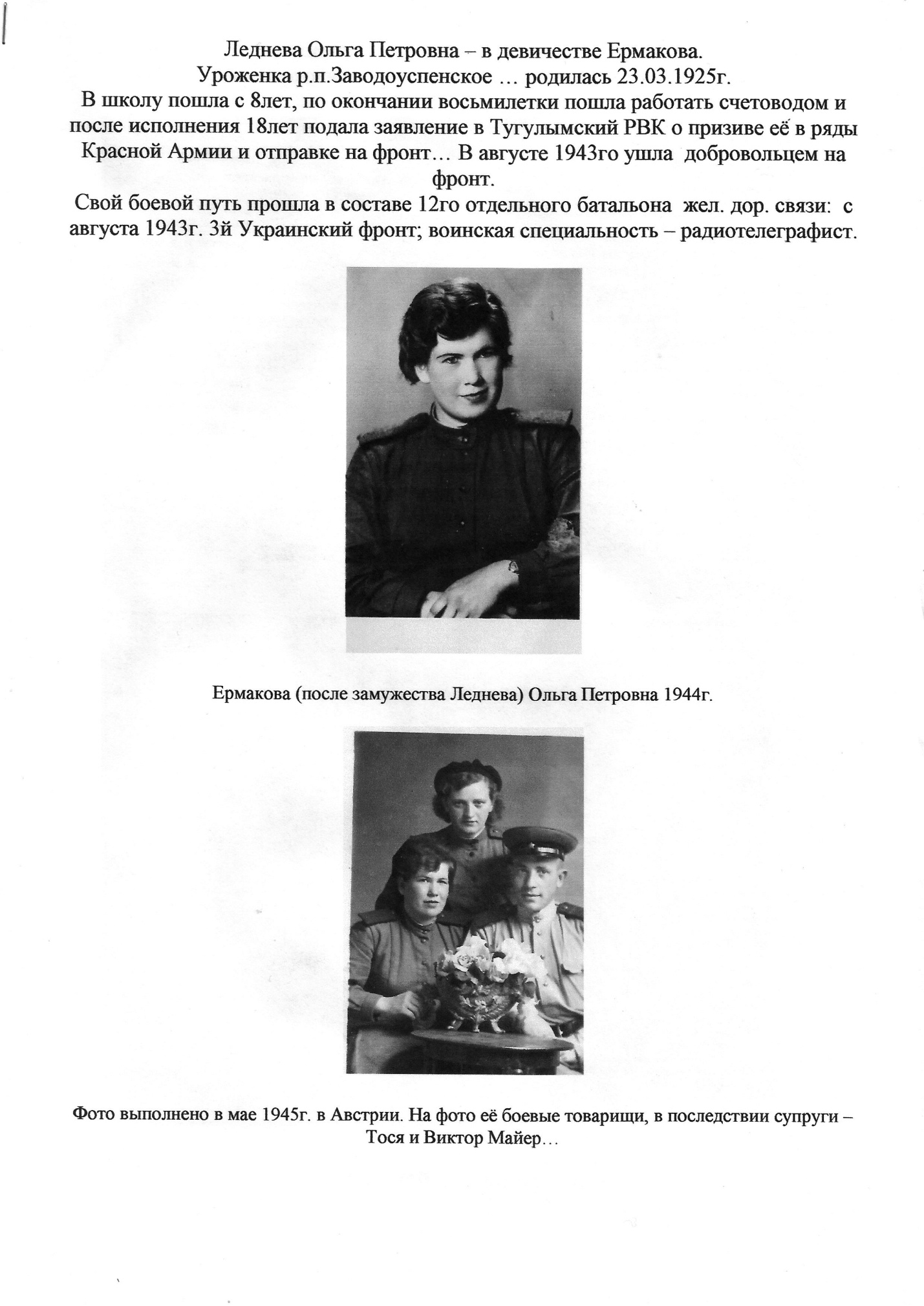 Леднёва Ольга Петровна, радиотелеграфист, на фронт ушла добровольно в августе 1943года, в возрасте 18 лет. Долго добивала такого разрешения, человек редкого мужества и обаяния. В нашей памяти осталась как добрый, улыбчивый человек при встрече в любых жизненных обстоятельствах. Вырастила троих прекрасных сыновей. В их семьях царят добрые отношения и взаимное уважение, воспитанные Ольгой Петровной и строгим отцом, Семёном Васильевичем Леднёвым.