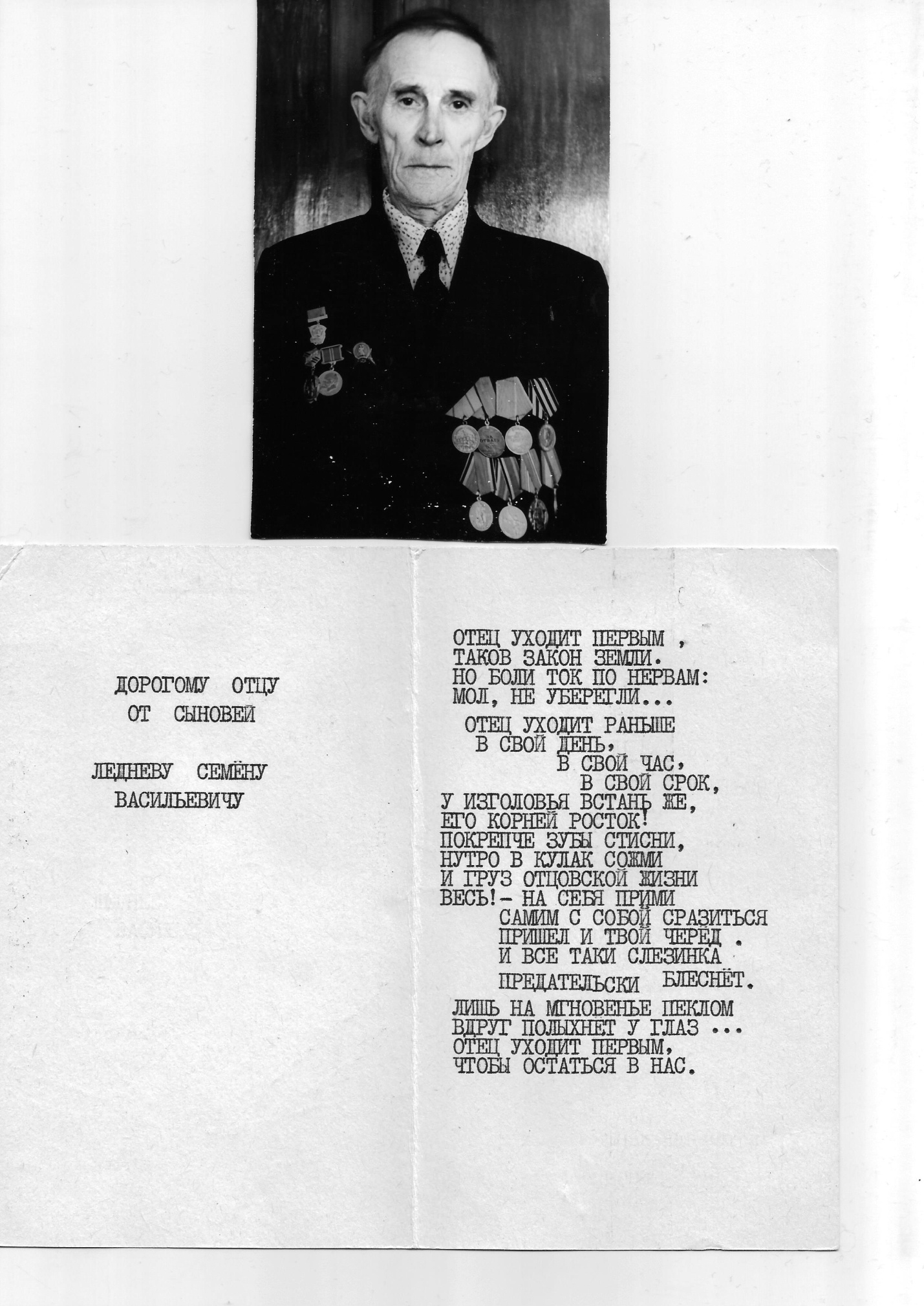 Для нашего вымирающего, бывшего рабочего посёлка Заводоуспенское, Тугулымского округа, Свердловской области, семья Леднёва Дмитрия Семёновича образец стойкости в невзгодах. Через него я получаю всю информацию о сегодняшней жизни посёлка, людей населяющих его. Это и есть связь поколений, необходимость которой мы и воспитываем в наших детях. Пока мы живы, наша память скрепляет добрые чувства и намерения в делах.
