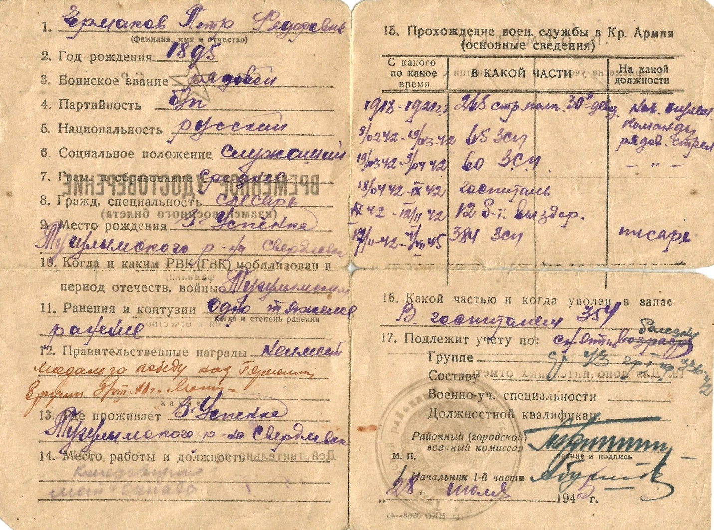 Ваганов Иван Григорьевич, 1914 г.р., рядовой; с 08.1941 г. по 01.1942 г. – 777 артиллерийский полк, шофер; награды: медали «За победу над Японией», «50 лет Вооруженных сил»; ранений не имеет. Домашний адрес: ул. Шувалова, 15.