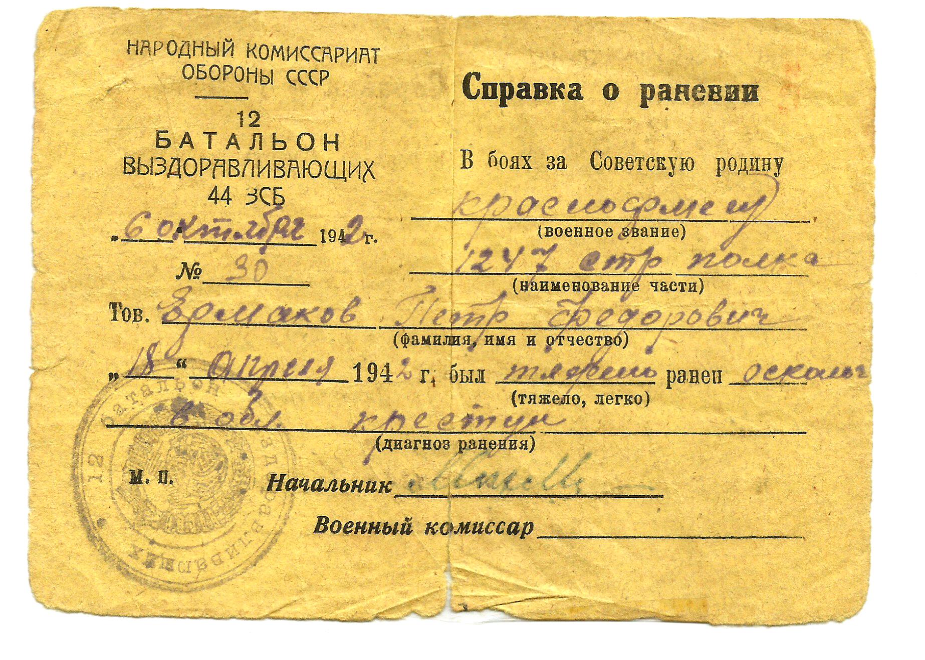 Справка о ранении: в боях за Советскую Родину рядовой 97 стрелковой дивизии Михаил Андреевич Деревенчук 24 декабря 1943 г. был тяжело ранен. Полная неподвижность левого локтевого сустава после слепого осколочного ранения на ткани левого плеча с переломом плечевой кости в верхней трети.