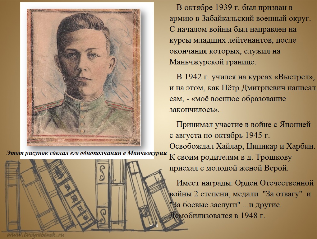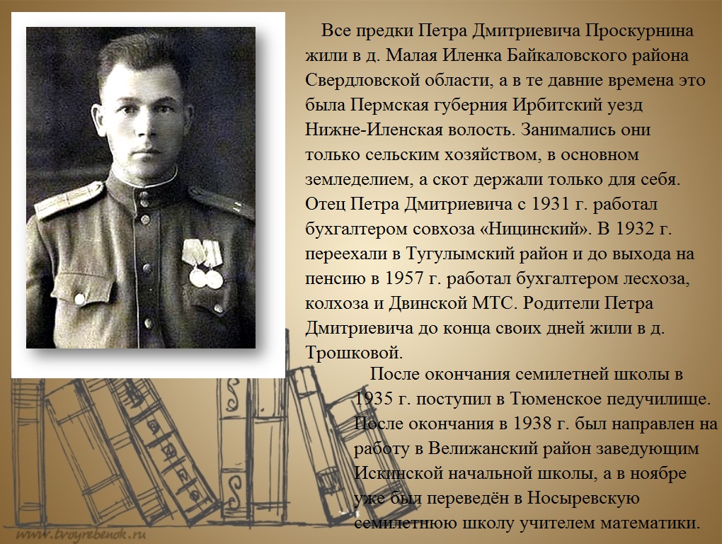 Проскурнин Петр Дмитриевич,15.06. 1919-21.08.2005 г., Забайкальский фронт. Награды: Орден Отечественной войны 2 степени.медаль За боевые заслуги, За победу над Японией и др. Был командиром взвода противотанковых орудий. Особенно отмечал взятие Харбина и Цицикара…Самураи умели воевать и были очень упорны в бою. Пётр Дмитриевич помнил, как они трое суток сидели в окопах заполненных водой под огнём снайперов и прикованных к пулемётам смертников…На память об этом эпизоде войны остались хронические болезни, память о погибших друзьях… Капитан Красной (Советской) Армии..Преподавал историю…Был директором вечерней и средней школ……