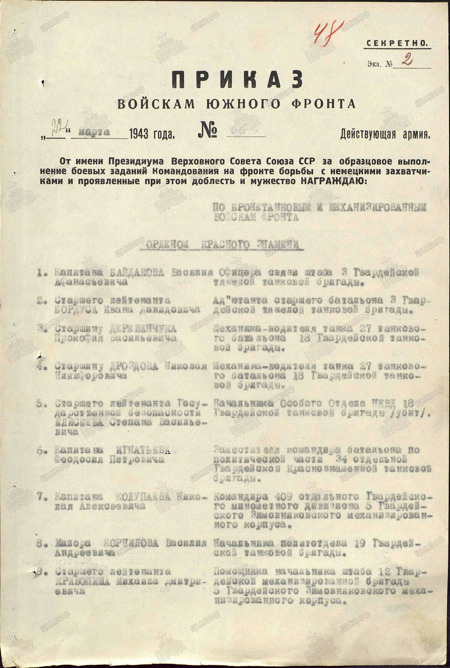 Деревенчук Прокопий Васильевич из посёлка Заводоуспенское. Был он на Сталинградском фронте с 27 августа 1942 по 1 октября 1943года. Механиком-водителем 62 танковой бригады 7 танкового корпуса в составе 1 гв. армии. 4 сентября 1942 года он получил легкое ранение. Родственники рассказывают, что он горел в танке, только на каком фронте неизвестно.