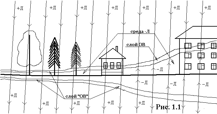 В северном полушарии поток энергии «Л» течёт на землю, как дождь. Её принимают почти все живые организмы, включая человека, она пронизывает и тела неживой природы. Но есть и такие живые организмы, которые не принимают энергию «плюс Л» или «+Л», приходящую из Космоса. Они научились от неё защищаться при помощи своеобразного «щита», назовём его «нуль В» (0В), под которым образуется и сохраняется «среда минус Л» (среда –Л). «Среда –Л» и два слоя «0В» стелются по поверхности земли, покрывая её, как ковёр. Этот «ковёр» в лесу, в поле, т. е. на природе имеет толщину 20-30 сантиметров, а энергии в нём слабые (см. рис. 1.1), вот именно этот «ковёр» («среда –Л» и слои «0В») в «Откровении» (см. «Из личного дневника автора»; запись от 27.06.01 г.) мы образно назвали «Змеем».