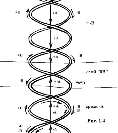 Для того, чтобы закрыться от Небесного Света, некоторые существа, в том числе и Человек, умеют создавать и поддерживать «среду –Л», при помощи своей энергии «–В», (вырабатывая энергию «–В»). В «среде –Л» возникает энергия «–Л», которая не совпадает по направлению с той энергией, движущейся навстречу ей энергией «+Л», т. е. Небесного Света. В местах встреч энергий происходит наложение этих энергий, частичное «пережигание», и возникают два слоя, названные нами «0В». Здесь происходит явление похожее на известное в физике как «явление интерференции» (наша версия). В самом слое «0В» энергии «+В» и «–В» также «перегорают» почти полностью, до «нуля», поэтому мы и назвали этот слой «нуль В» (0В), (см. рис. 1.4).