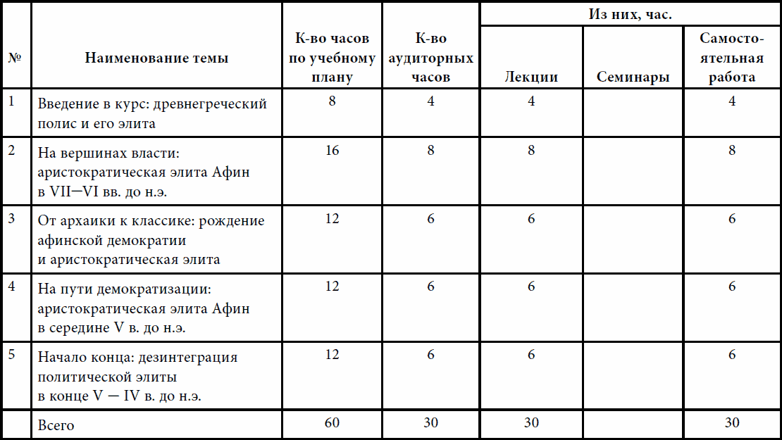 Исключительно значительную роль в общественной жизни всех древнегреческих полисов, в том числе и демократических, играли политические элиты различного характера (аристократические, демократические, олигархические и т. д.). В историографии античности этот фундаментальный фактор зачастую недооценивается или принимается во внимание не в полной мере, а между тем он принципиально важен для понимания общего характера политических структур античного мира. Соответственно, одной из наиболее серьезных проблем, встающих в связи с изучением античного греческого полиса и сложившегося в его рамках социума, является роль политических элит в нем. Задачей настоящего курса является освещение актуального и перспективного для изучения, но в целом недостаточно исследованного в антиковедении круга проблем, связанного с местом элит в полисе, их типологией, их механизмами власти и идеологическим обоснованием этой власти. В курсе с большей или меньшей степенью детализации затронуты такие вопросы, как основные типы полисных элит в их взаимном сопоставлении, методы достижения и сохранения влияния, практиковавшиеся элитами, институциональные и неинституциональные факторы положения элит в полисе, соотношение этих факторов, взаимоотношения элит и гражданского коллектива, выявление основных характеристик этих элит в синхронном и диахронном аспекте, их эволюции в связи с изменением общих исторических условий. Очерченная тематика представляется важной и интересной в свете возрастающего в мировой науке интереса к фундаментальным проблемам политической жизни античного мира, одной из которых является проблема элит.