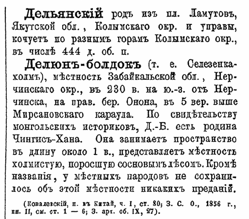 Это географическая справка о Делюн-Болдоке в «Географическо-статистическом словаре Российской Империи», составленном Петром Петровичем Семеновым (Тян-Шанским). Данные, как видим, почерпнуты им из книги Егора Петровича Ковалевского «Путешествие в Китай», ч. 1, стр. 80, 1853 года издания (на фотокопии указан ошибочный год – 1856). Вот оригинал книги, та самая 80 стр.: