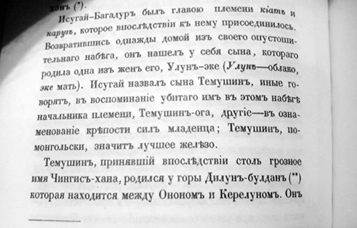 § 59. Тогда-то Есугай-Баатур воротился домой, захватав в плен Татарских Темуджин-Уге, Хори-Буха и других. Тогда-то ходила на последах беременности Оэлун-учжин, и именно тогда родился Чингис-хаган в урочище Делиун-балдах, на Ононе. А как пришло родиться ему, то родился он, сжимая в правой руке своей запекшийся сгусток крови, величиною в альчик. Соображаясь с тем, что рождение его совпало с приводом Татарского Темуджин-Уге, его и нарекли поэтому Темуджином.