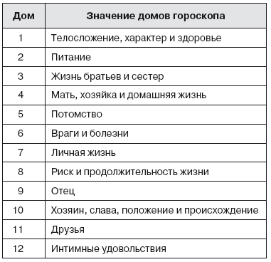 Гороскопы животных строятся как обычно: на дату, час и место рождения. Значения домов гороскопа могут быть, например, такими, как в таблице 1.2. Экстерьер, поведение и здоровье животного определяются, в частности, положением Солнца и Луны при его появлении на свет.