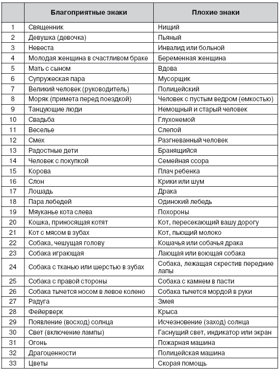 Перечислим общие знаки, благоприятные для поездок: (1) священник, возносящий молитвы, (2) танцующие люди, (3) емкость с водой, (4) моряк. К добрым знакам также относятся: (5) музыкальные инструменты, (6) бой часов, (7) распустившиеся цветы, (8) девочка младше 10 лет, (9) женщина в расцвете сил, имеющая счастливый брак, (10) мать с сыном.