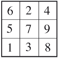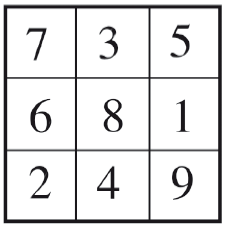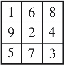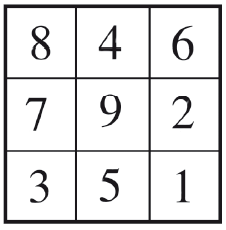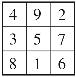 Юг (цифра 9) располагается сверху, север (цифра 1) – снизу, восток (цифра 3) – слева, а запад (цифра 7) – справа. Числа в квадрате расположены так, что сумма любых трех из них, находящихся в одном ряду по горизонтали, вертикали или диагонали, равна 15. Это половина лунного месяца – число дней, за которое Луна проходит от фазы новолуния до полнолуния[21].