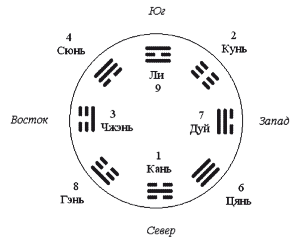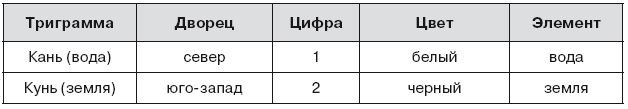 Каждой цифре ло-шу соответствуют определенная триграмма и-цзин (рис. 1.6), элемент и цвет. Строго говоря, наоборот – каждой триграмме соответствует свой номер, элемент и цвет (таблица 1.4).