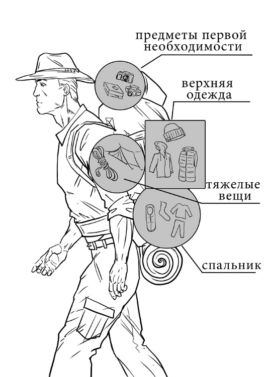 Укладка рюкзака: верхняя часть рюкзака (клапан) удобна для вещей, часто используемых и хрупких: аптечка, фотоаппарат, фонарик, средства гигиены; в верхней части рюкзака расположите вещи, которые могут понадобиться в течение дня: флиска, пуховка, накидка; по центру спины кладите тяжёлые вещи: горелку, еду, палатку; внизу рюкзака – спальник и лёгкие вещи. Коврик (каримат) скручивается и цепляется снизу или сбоку рюкзака, но не внутрь его, так как он занимает значительный объём. Независимо от продолжительности путешествия в походном рюкзаке обязательно должен быть базовый необходимый набор вещей: налобный фонарь, дождевик/плащ/накидка/пончо для вас и для рюкзака, фляга/кружка, то есть ёмкость для переноса и кипячения воды, ремнабор (иголка, нитки, армированный скотч, многофункциональный нож-инструмент), спички в непромокаемой упаковке, аптечка. Этот необходимый минимум и его нельзя никоим образом игнорировать. Дополнительно желательно иметь аварийный набор: большой полиэтиленовый пакет или “гермомешок”, изотермическое (космическое) одеяло, дополнительный полностью заряженный аккумулятор и/или батарейки для телефона, навигатора и/или рации, ручка с блокнотом, несколько высококалорийных батончиков, предметы личной гигиены, “паракорд” (моток верёвки), сухое горючее, сигнальный свисток, компас с лупой.