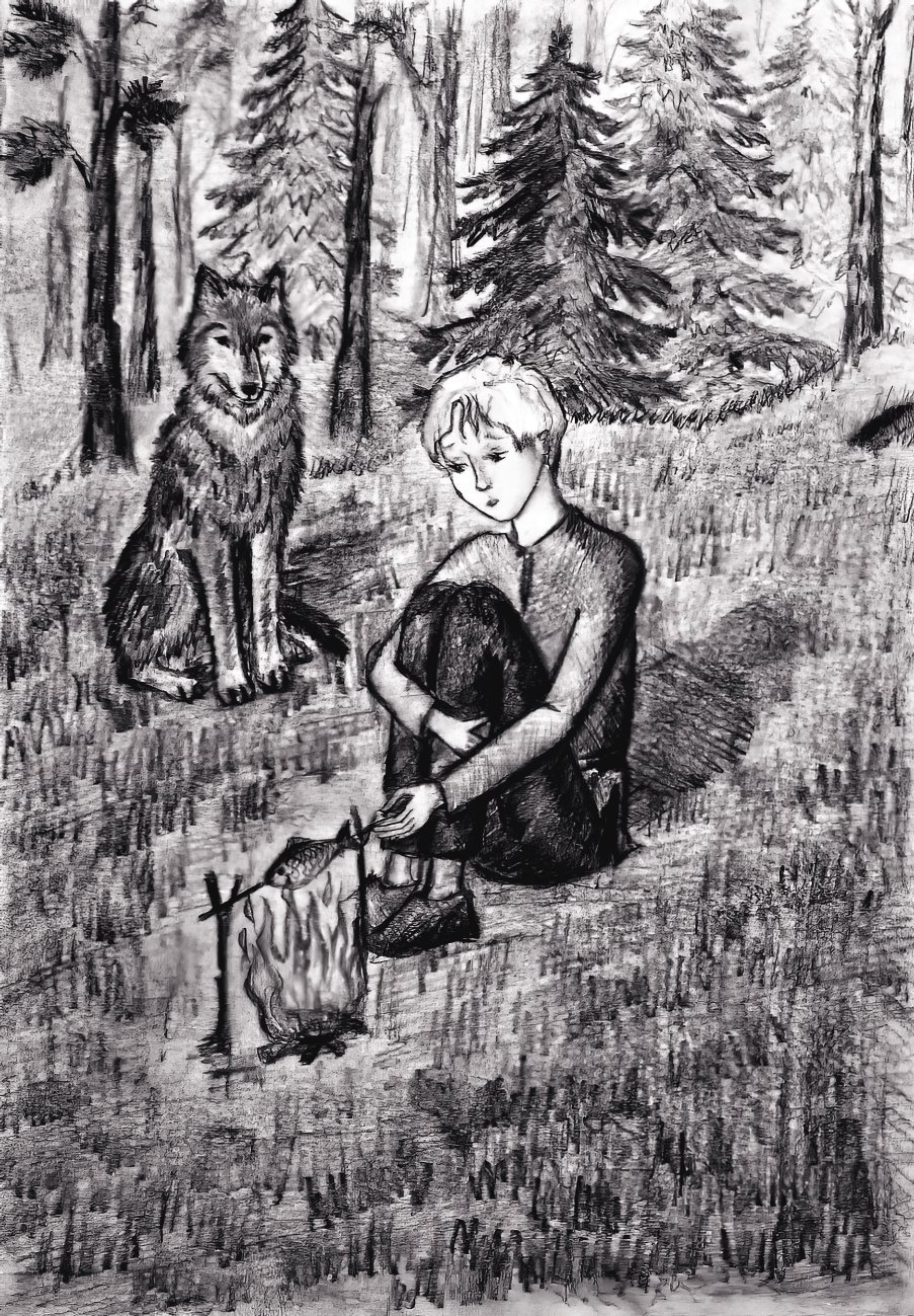 Наступала ночь, пора было ложиться спать. Мальчик затушил костёр, забрался в лаз и улёгся на валежник, а у его ног разместился большой серый волк.
