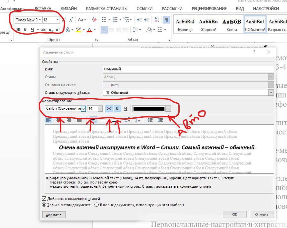 В строке стилей выбирается Обычный, затем кликнуть в самой верхней левой строке экрана букву А с кисточкой, выбираете снизу третью строку Создать стиль, клик, в новом окошке даёте своё название стилю, например, Центр 14 и новый стиль появляется в строке стилей. Далее в строке стилей выбираете стиль Центр 14, клик правой кнопкой мыши, Изменить и далее настраиваете стиль как было указано выше.