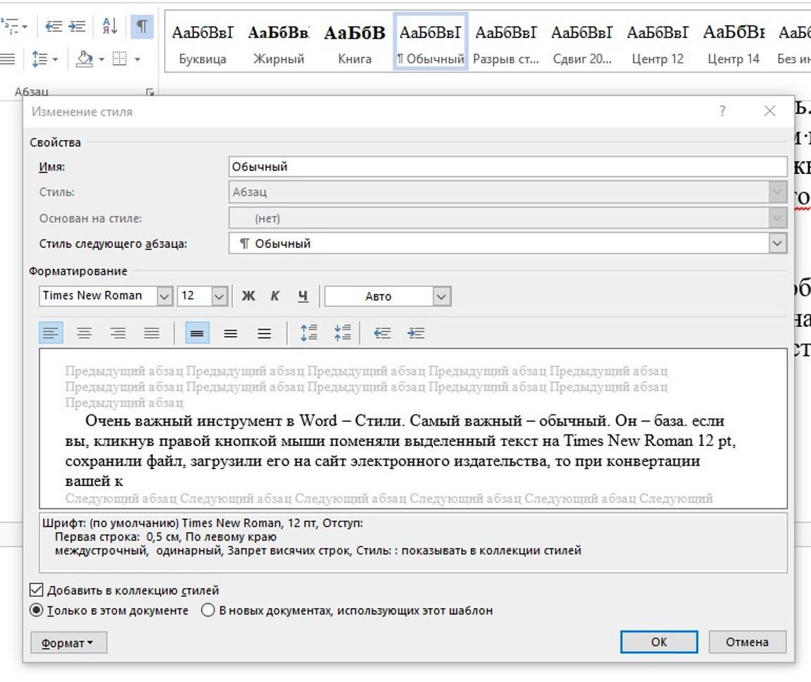 Чтобы этой неприятности не произошло, необходимо в строке стилей выбрать Обычный, клик правой кнопкой мыши, выбрать Изменить и выставить шрифт Times New Roman 12 pt, выравнивание по левому краю, не жирный, не курсив, не подчеркивание, междустрочный одинарный интервал, цвет Авто (он будет черным при обычном и становиться белым при ночном режиме чтения). В результате получится следующее.