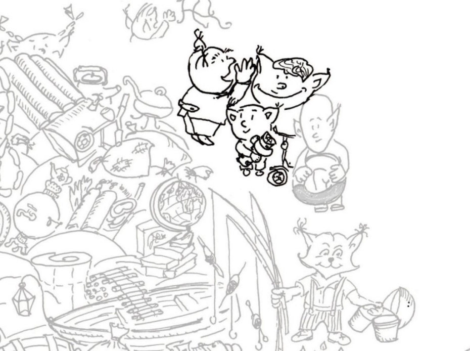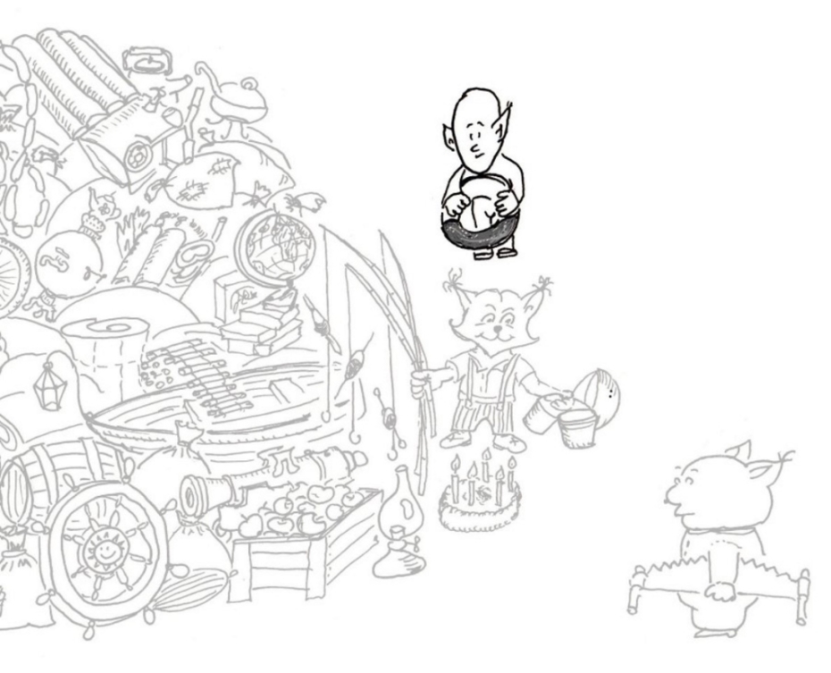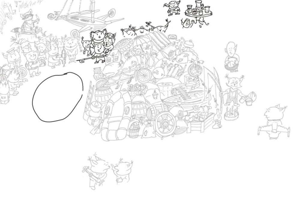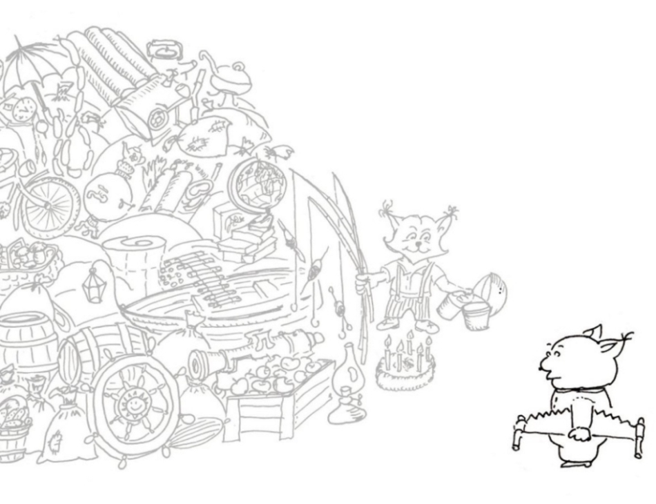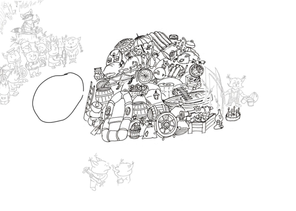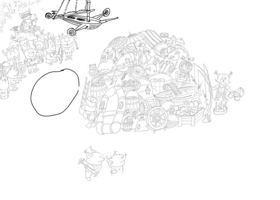Конечно, по доброте душевной, по простоте и незнанию, по огромному желанию помочь в куче, помимо тандема с горшочком мёда, мы наблюдаем зонт, часы-ходики с кукушкой, самовар, колесо от мотоцикла, казан для плова, акваланг в комплекте (очень нужный пешему туристу), верёвочная лестница, пушка для салютов, торт со свечами, глобус, ушат огурцов, просто лестница (а вдруг куда надо будет залезть?!), надувной матрас (отдохнуть). Милый персонаж, который уже на двух рисунках был на лодке, притащил её вместе с фонарём с желанием и помочь нашим героям, и, хоть временно, избавиться от лодки. Он же в ней и днём, и ночью! Хоть поспит пушканчик.