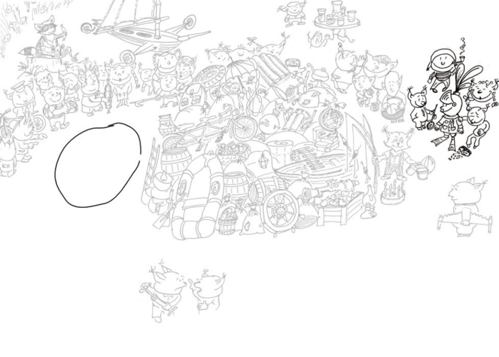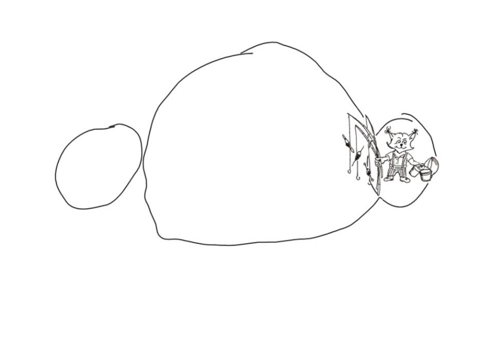 В центре композиции особенно активный деятель типа Лютикова в приключениях Анискина. Этот готов ко всему. Я раньше придумал, что будет обязательно кем-то принесённый рыцарский шлем, но сам не ожидал, что он получится на голове у пушкана, который ещё к тому же наденет ласты, а в карман попросится гаечный ключ. Вот такой забавный персонаж в ластах и рыцарском шлеме с плюмажом получился.