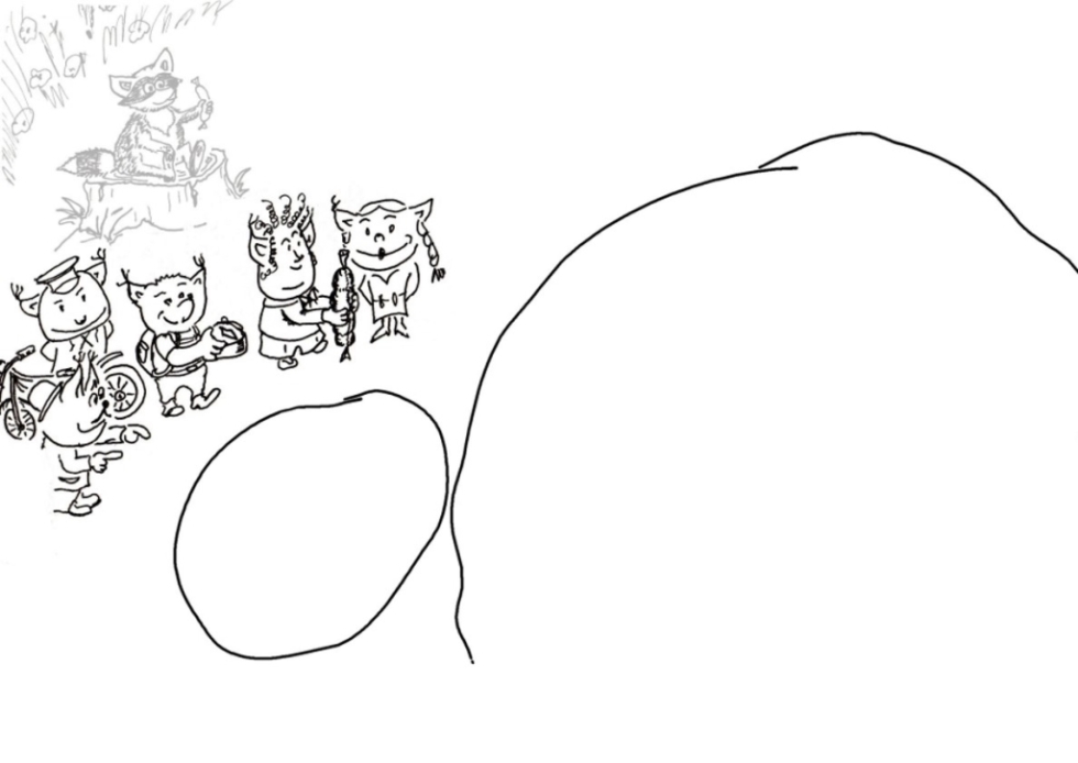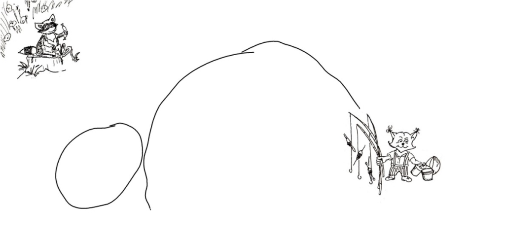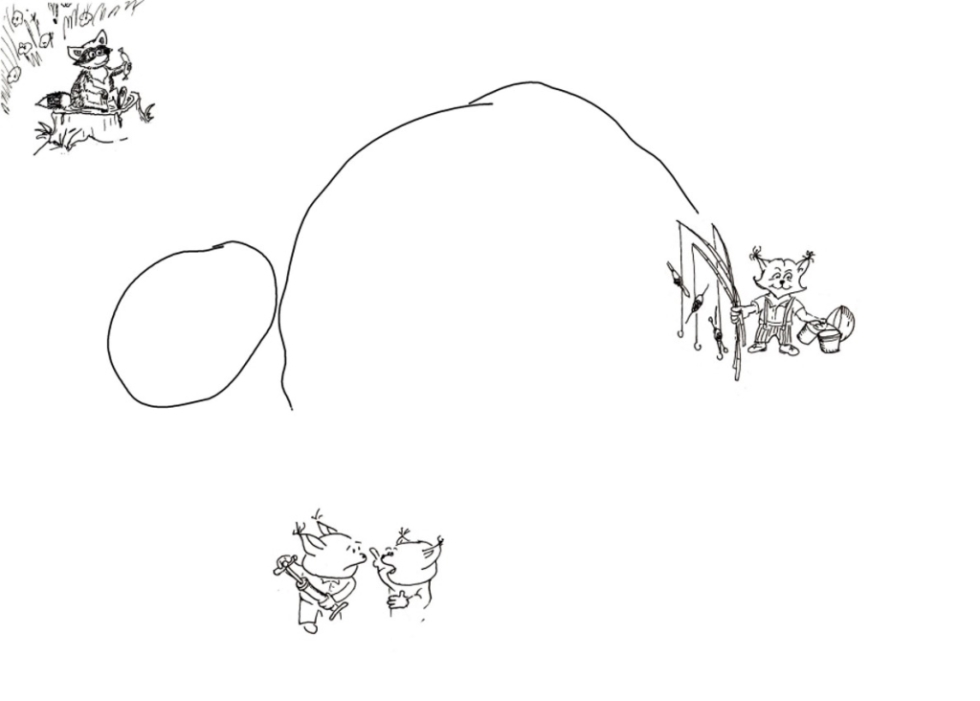 Следующий персонаж, который родился сразу и первым был прорисован – енот Егор. Он изначально должен был сидеть в кустах и оттуда выглядывать. Но, поскольку дело интересное и долгое, то наблюдать ему из кустов, наверное, утомительно и Егор обзавёлся личным пеньком с которого удобно лицезреть за тем, что происходит. Сидит он в позе Миши (любимого кота Мишеньки). Но позже Миша проголодался. Проголодался и Егор, поэтому ему в лапку добавлена колбаска, так то Егорке не грозит похудание в ближайшее время.