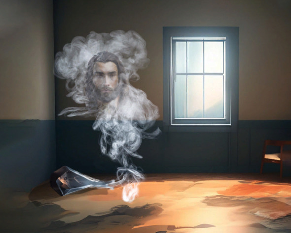 А над флягой уже парит облачко. Оно расширяется, постепенно принимает форму полупрозрачного человеческого лица. Это лицо шевелится, вытягивается в разные стороны, затем снова становится лицом обычного человека. От лица вниз тянется вздрагивающий хвост, продолжающий вылетать из фляги. Он растет в ширину и вскоре, вместе с лицом, становится похожим на колышущееся в воздухе существо с тем же человеческим лицом. Это существо продолжает, увеличиваться в размерах.