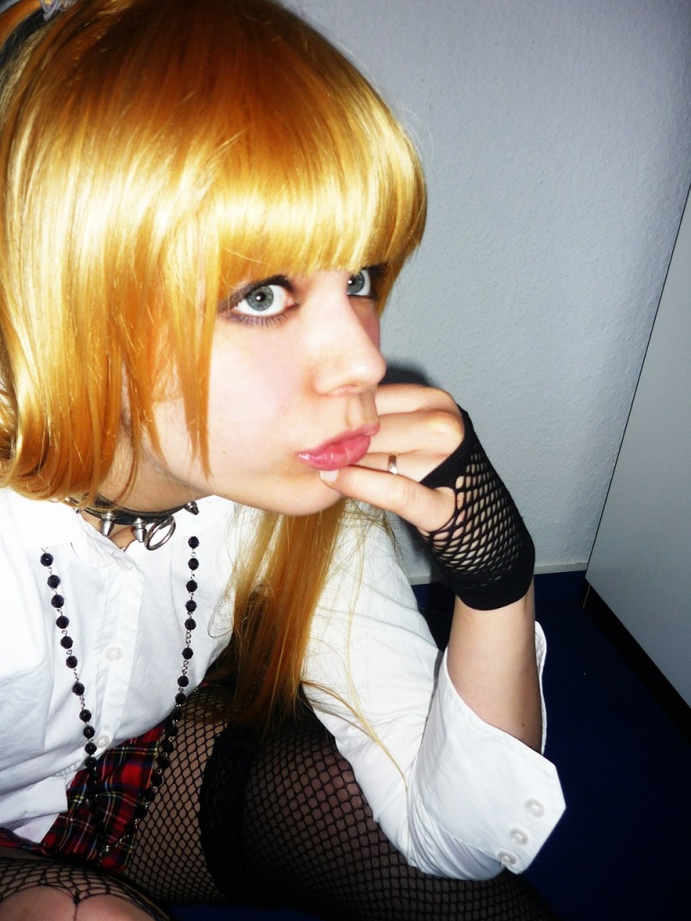 А вот с макияжем – полный швах. Наложен профессионально, слов нет. НО получилась лицо «шлюхи»… Я такое называю – шлюхастое. Фу… Мне не понравилось, руки тянуться переделать… Наложить базу, стереть эти вульгарные тени, отодрать накладные ресницы, стереть излишний румянец. И наконец-то убрать нафиг это кроваво-красное безобразие… Одеть ЕЕ в приличную, повседневную одежку, а не в эти “сетки с подвязками” и мини-юбку…