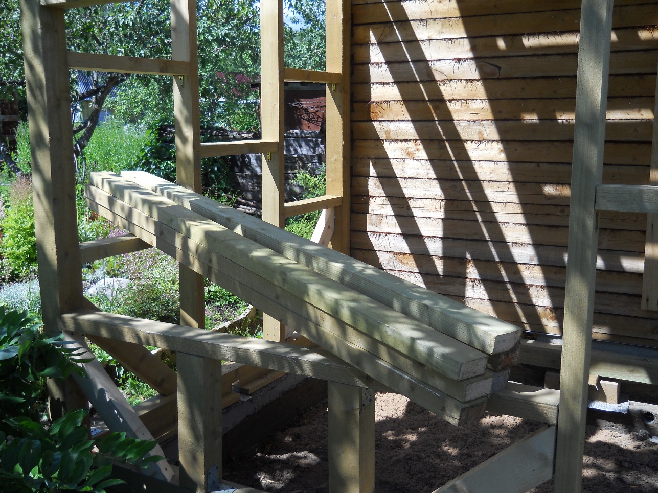 На веранде будет только черновой пол, с утеплителем базальтовой ватой. Всю голову сломал прежде, чем придумал, как уложить базальт. А все гениальное просто. К нижней плоскости половых лаг (брус 200х50) привинтил на шурупы 150мм доску. На получившиеся выступы по краям уложил обрезки досок, а по ним уже расстелил базальтовую вату. Все, можно настилать половую доску.