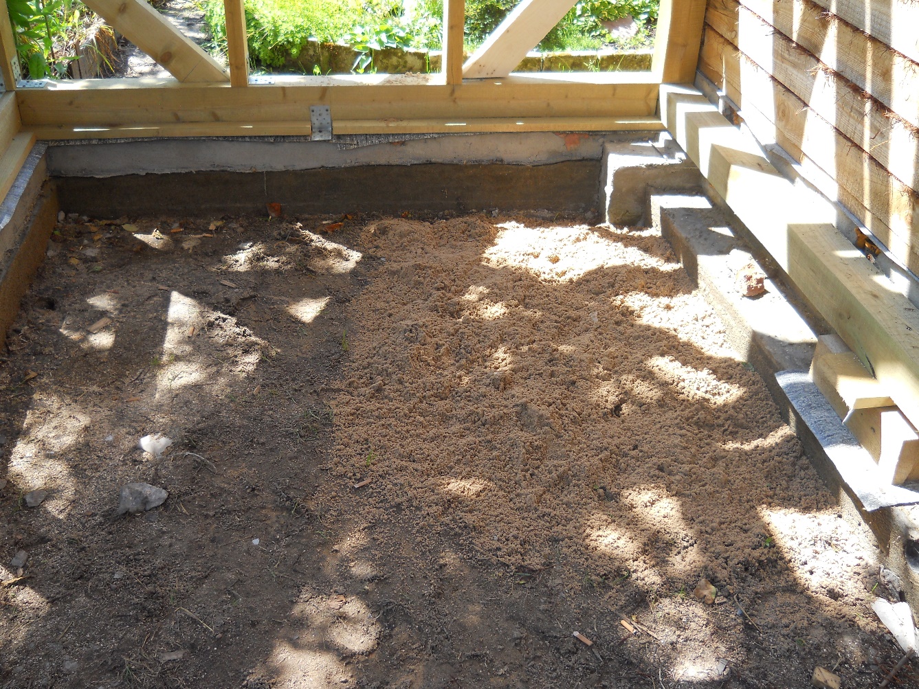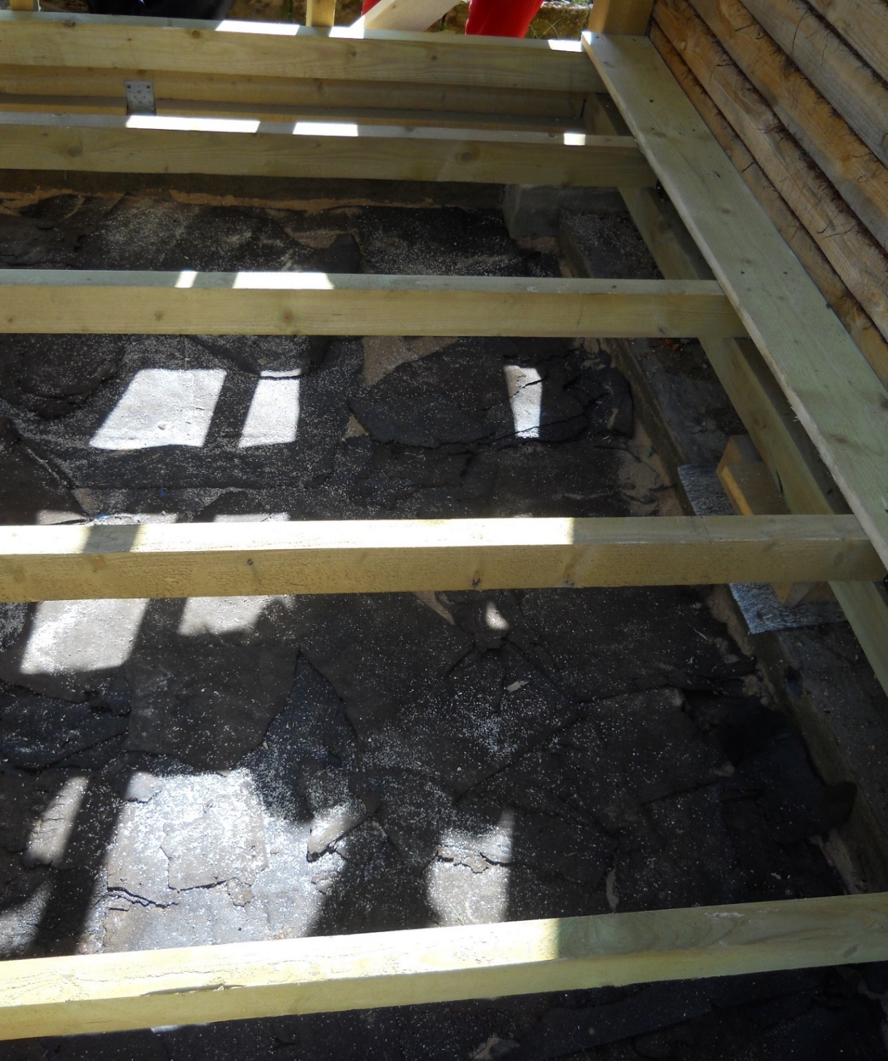 Песок засыпали, разложен рубероид, ну не ходить же по готовому. Надо делать пол, все бросили, ставим половые лаги.