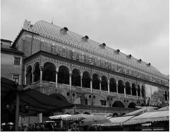Построенное в эпоху расцвета Падуи, в 1306 г., на площади Фруктового рынка здание ратуши, палаццо делла Раджоне, славится необычной формы крышей лоткового свода килевидного сечения. Длинный фасад ратуши открывается на площадь двухъярусной лоджией, изящная колоннада с полукруглыми арочками верхнего яруса которой покоится на мощных полукруглых арках нижнего, придавая всей конструкции ощущение надежности и гармоничности. На втором этаже ратуши расположен один большой зал, перекрытый высоким стропильным сводом на стрельчатых арках, предназначавшийся для проведения приемов и торжественных заседаний городского совета.