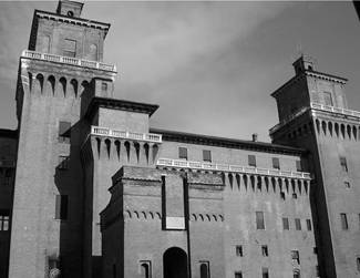 Большинство зданий Феррары построены из красного кирпича, самое величественное ее сооружение – огромный замок д’Эсте, строительство которого велось на протяжении нескольких веков. Старейшая часть замка возведена Никколо II в конце 14 в. Выросший посреди широкой городской площади, застроенной невысокими домами, поднимается прямо из воды окружающего их широкого рва мощный четырехугольник укрепленных огромными башнями высоких стен, создавая разительный контраст между суровым герцогским замком и окружающей его городской застройкой, напоминая, что в те времена власть даже самых уважаемых и популярных правителей была весьма непрочной и их жизни всегда угрожала опасность. Над арками завершающих стены машикулей надстроены более поздние крытые галереи, по углам усиленные мощными квадратными башнями, к которым пристроены более низкие башни. От одной из башен ведет через ров подъемный мост, с двух сторон защищенный небольшими квадратными башнями разной высоты, так, что со стороны они образуют три ступени. Крытый переход соединяет старый замок с новым, стены которого, увенчанные зубцами в виде ласточкиных хвостов, ограничивают обширный внутренний двор с внешними ренессансными лестницами и лепными порталами входов. Над замком возвышается мощная квадратная башня с машикулями, являя символ могущества герцогской семьи.