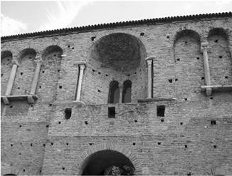 Кирпичный фасад древнего полуразрушенного здания приписывается дворцу Теодориха, хотя, по-видимому, это когда-то была церковь. Двухъярусная стена открывается вверху полукруглой аркадой глухих арок, разделенных тонкой белой колонной, установленной на резной консоли. Соседнюю огромную романскую церковь Сант-Аполинаре Нуово начали возводить в 6 в., перед ее треугольным фасадом с пристроенной квадратной колокольней выступает широкий белокаменный нартекс с полукруглыми аркадами на изящных колоннах – открытое помещение перед входом, в котором полагалось находиться некрещеным во время службы в эпоху ранних христиан. В интерьере три нефа разделены полукруглыми аркадами, стены над которыми украшены мозаиками. Ближе к алтарной части изображены фигуры мучениц и мучеников, а у входа друг напротив друга – мозаики с изображением дворца Теодориха и порта в Классе, датируемые 6 в., эпохой наивного искусства.