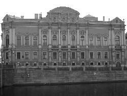 На Дворцовую набережную Невы обращен фасад Мраморного дворца, построенного фаворитом Екатерины II графом Г.Орловым. Стены светлого трехэтажного здания с белыми карнизами и наличниками окон третьего яруса облицованы панелями из нескольких сортов мрамора, два верхних яруса украшают мраморные пилястры, фланкирующие окна.