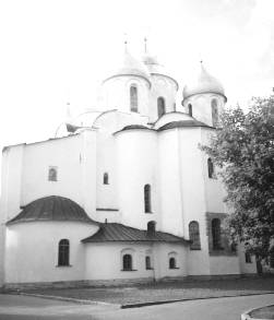 На другом берегу реки, напротив Детинца, находится Ярославово Дворище и Торг. Здесь новгородский князь Ярослав поставил в первое десятилетие 11 в. свой дворец, здесь же находилась вечевая площадь. Древнейшим сооружением является белокаменный Никольский собор, заложенный сыном Владимира Мономаха в 1113 г. Его стены разделены пилястрами на четыре части, завершающиеся полукруглыми закомарами, в алтарной части возведены три равновеликие апсиды во всю высоту здания. Двухъярусный собор завершают пять приземистых куполов на цилиндрических барабанах с окнами и аркатурным поясом.