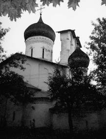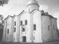 На другом берегу реки Великой стоит древнейший в городе Мирожский монастырь, обнесенный низкой белокаменной стеной. Его Спасо-Преображенский собор построен в 1156 г. в традициях византийской архитектуры. Четверик церкви, над западным фасадом которого возвышается двухпролетная звонница, имел закомарное навершие, о чем свидетельствуют дугообразные завершения прясел. Над четырехскатной крышей на очень широком барабане с узкими окнами и аркатурным пояском покоится огромный луковичный купол. Собор знаменит своими фресками, созданными греческими мастерами в 12 в. и являющимися единственными сохранившимися в России росписями церкви домонгольского периода.