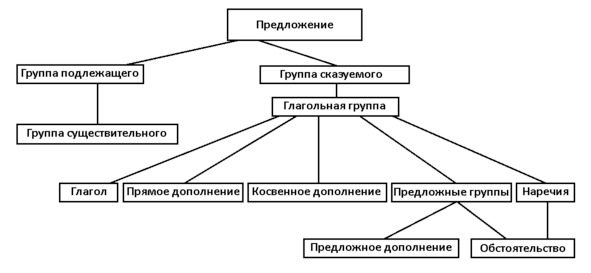Попытки составить полное описание порождают обширную классификацию. От того, как это делать, зависит оптимальность результата. В литературе выделяют следующие категории. На лексическом уровне (отдельных слов) это части речи, словосочетания, группы существительного и глагола. На синтаксическом (уровень предложения) – члены предложения, группы подлежащего и сказуемого. Эти уровни перекрываются. Если сказуемое выражено глаголом, то группа сказуемого будет группой глагола. Кроме группы подлежащего, именная группа может также играть роль прямого дополнения, а предложная группа – предложного.