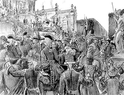Бенуа А., Лансере Е. Приезд Императрицы Елисаветы Петровны рано утром с тетеревиных токов в «Монбеж»