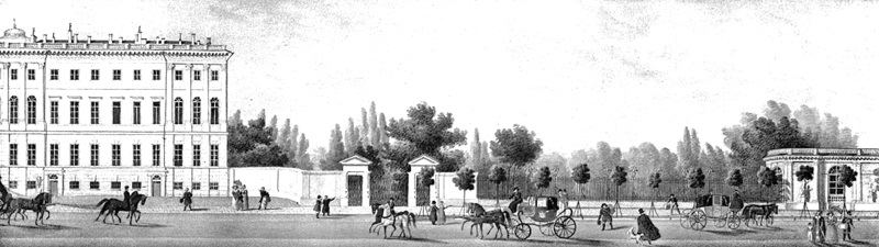 Наряду с работами, проводившимися во дворце, перестраивалась также усадьба: проведена перепланировка сада, обновлены Кухонный флигель, Конюшенный корпус и Манеж[55], садовые павильоны и ограды. В 1818 г. был приобретен дом лейб-кучера И. Байкова с обширным участком по набережной Фонтанки[56], что повлекло за собой последующую перепланировку территории, прилегающей к усадьбе резиденции.