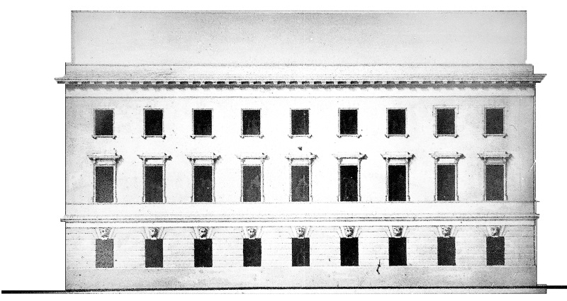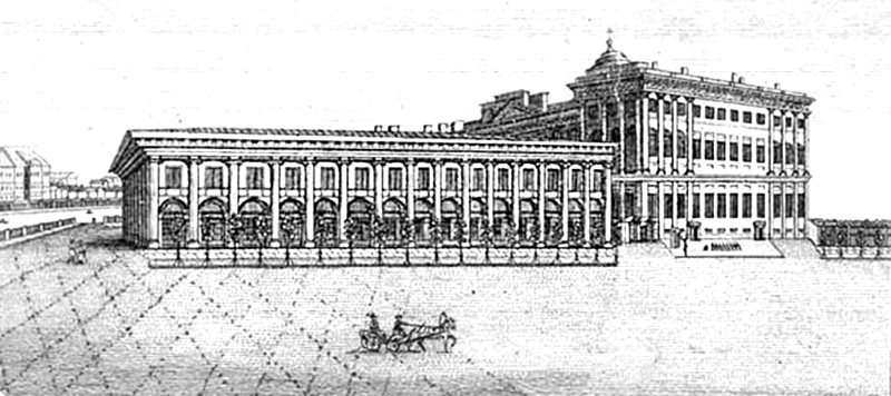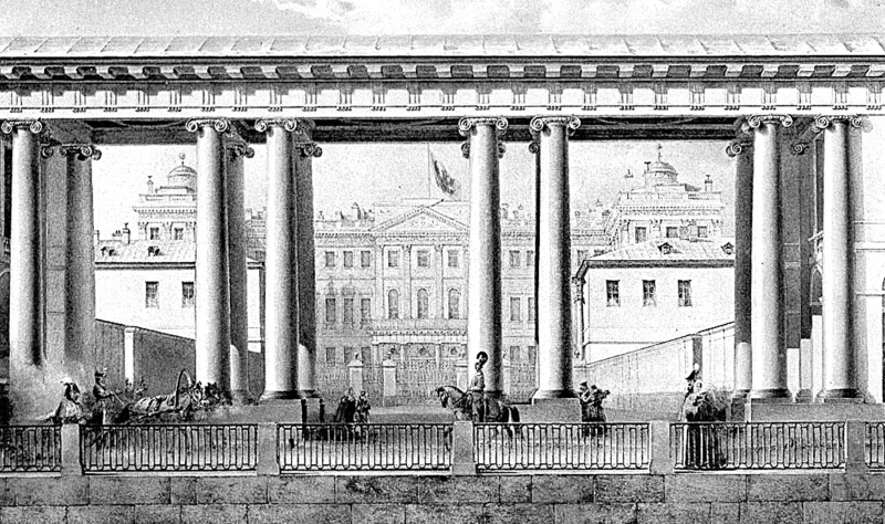 Следует заметить, что двор Аничкова дворца, выходящий на Фонтанку, после засыпки гаванца и разбора деревянной галереи отдали под склады лесных товаров, поначалу предполагая оградить его каменным забором. Потом предполагалось построить каменный корпус с магазинами внизу и жилым верхним этажом, что должно было не только украсить часть Невского проспекта у Аничкова моста, но и приносить некоторый доход – 20–25 тыс. руб. ежегодно. Смета по строительству здания предполагала траты в сумме 226 298 руб. Причем к 1803 г. почти половина этой суммы в распоряжении Кабинета уже имелась[47]. 10 января 1803 г. Александр I распорядился начать строительство здания Кабинета: «Быть по сему, а строение производить Гваренгию под собственным наблюдением управляющего Кабинетом». Причем из двух представленных проектов Александр I «изволил апробировать те планы, которые с колоннами, признавая их лучшими и более красоты зданию дать могущими»[48].