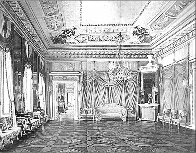 Вторая гостиная, декорированная Л. Руска пунцовым бархатом с белыми разводами, также имела живописный плафон. В 1817 г. К. Росси обновил интерьеры, изменив красный цвет обивки второй гостиной на «голубой с серебряными разводами и бортом по оранжевому с пальмовыми серебряными листьями и сверх того еще золочеными резными багетами»[104]. Именно тогда эта гостиная и стала Голубой. Но в ходе очередного ремонта (1848) гостиная вновь изменила цвет и, соответственно, название.