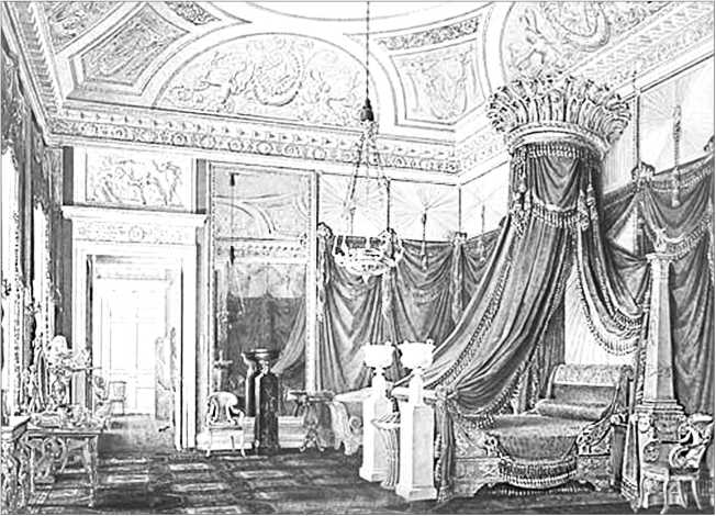В декабре 1840 г. Николай I распорядился, чтобы «голубым бархатом убрана была Опочивальня Собственного Его Императорского Величества Дворца, а желтым – Гостиная комната (или, правильнее сказать, та, которая и ныне убрана желтой тканью. – И. 3.) в оном»[111]. При этом А.И. Блоку от министра Императорского двора в качестве образца прислали «два куска бумажного бархата». Работы выполнил в начале 1841 г. «бархатный мастер» Алексей Гущин, который выписал необходимый бархат из Англии.