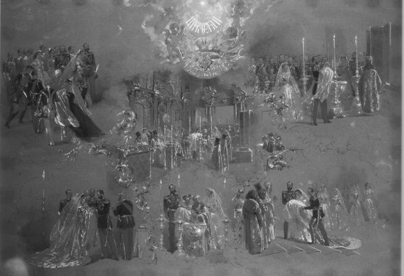 Крещение будущего Николая II состоялось 20 мая 1868 г. в Большой церкви Зимнего дворца. Судя по акварели М. Зичи, в этой процедуре самое активное участие принимал дедушка, Александр II, который, как и все остальные, отчетливо понимал, что совершается крещение не просто его первого внука, но, возможно, будущего императора. На акварели изображены четыре сцены крещения, и на двух из них Александр II держит своего внука на руках. Примечательно, что во время крещения в качестве ассистентов статс-дамы выступали два императора – Александр II и отец – великий князь Александр Александрович (будущий) Александр III. То, что отец, нарушая традиции, принимал активное участие в крещении, видимо, было связано с важностью происходящего. Два императора, действующий и потенциальный, держали на руках своего очередного преемника, укрепляя фундамент его легитимности.