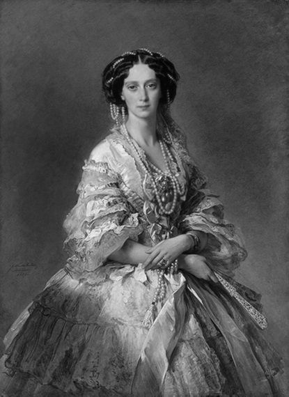 Одним из самых известных парадных портретов императрицы Марии Александровны стало полотно художника Ф.К. Винтерхальтера, законченное в 1857 г. На этом официальном портрете, написанном вскоре после коронации Александра II, мы видим женщину еще во всем блеске зрелой красоты. Волосы, руки и шея унизаны крупными жемчугами. Пышное парадное платье обильно украшено кружевами. В изящно сложенных руках – костяной, тонкой работы веер. Молодая императрица словно только вышла из бальной залы.