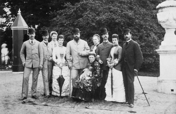 Следуя тенденциям европейской моды, русский цесаревич в Англии мог позволить себе надеть светлую модную «тройку» в довольно крупную клетку. Примечательно, что на фотографии, сделанной в середине 1870-х гг., мы видим двух любящих сестер (цесаревна Мария Федоровна, в девичестве датская принцесса Дагмар, и принцесса Уэльская Александра, старшая сестра российской цесаревны) в одинаковых платьях. Как правило, эти «парные» платья заказывались у известного парижского портного Чарльза Ворта. Таким образом сестры демонстрировали всем свою сохранявшуюся с детства близость.