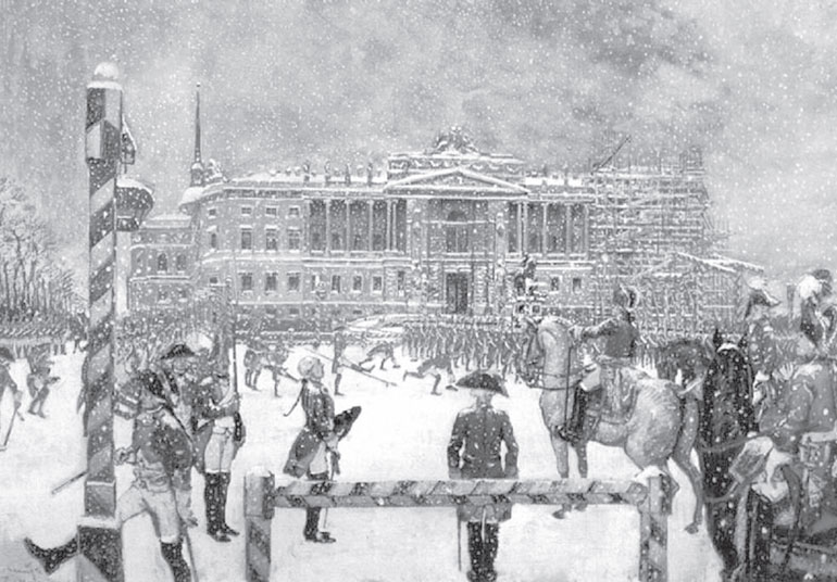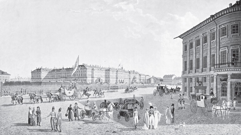 Еще раз подчеркнем, что внешний облик дворца начал меняться буквально в самый момент восхождения Павла I на трон. Будущий министр Императорского двора князь П.М. Волконский, бывший в Зимнем дворце в ночь присяги новому императору, упоминает, что, «увидев ходящих близ средних ворот Зимнего дворца нескольких офицеров в мундирах нового покроя, пошел к ним из любопытства; каково же было мое удивление, видев самого наследника, в 2 часа ночи, в мундире л. – гв. Семеновского полка нового покроя, в Андреевской ленте и шарфе по кафтану, и с ним вновь назначенного С.-Петербургским комендантом генерал-майора Аракчеева, плац-майора Капцевича и плац-адъютанта Апрелева, расставлявших новые пестрые будки и часовых (курсив мой. – И. З.). Наследник, увидев меня, подошел тотчас ко мне, спросил мое имя и которого я полка; на мой ответ сказал, оборотясь к Аракчееву: „Это нашего полка“».[48] Очень характерен уровень персон, лично принимавших участие в столь ответственном расставлении «прусских» полосатых будок вокруг Зимнего дворца.