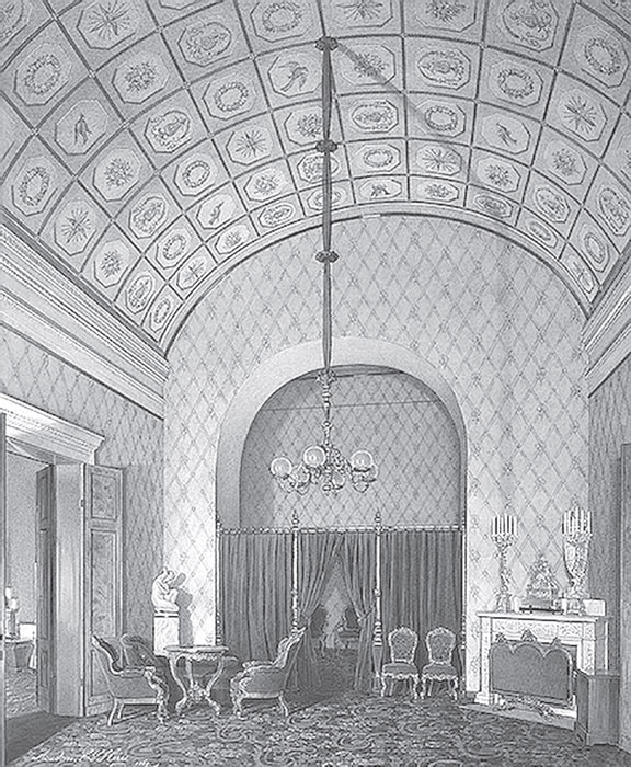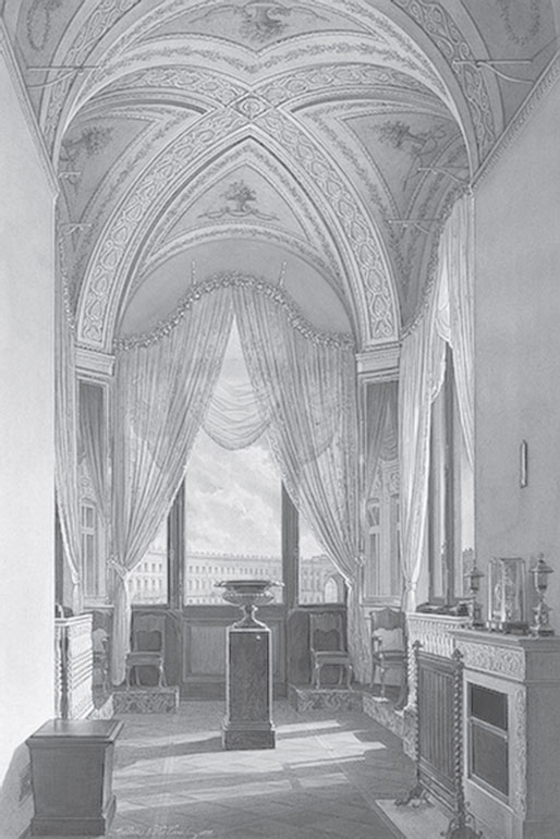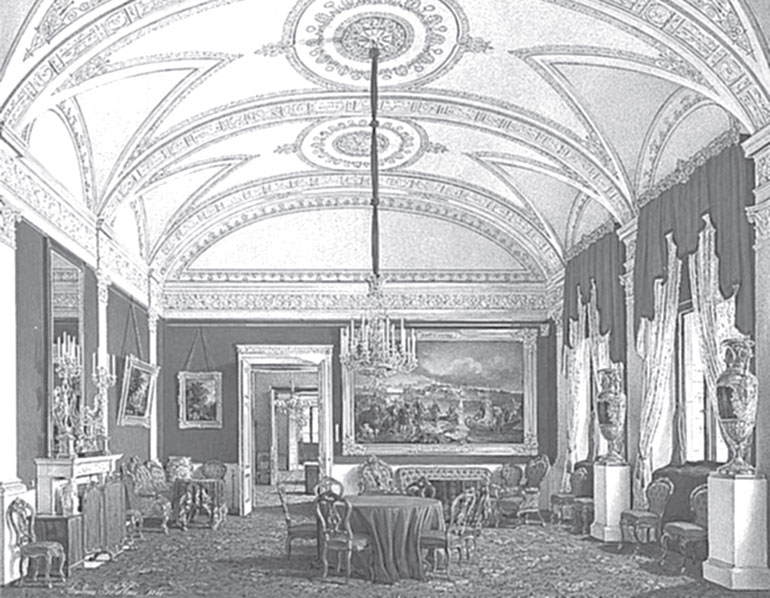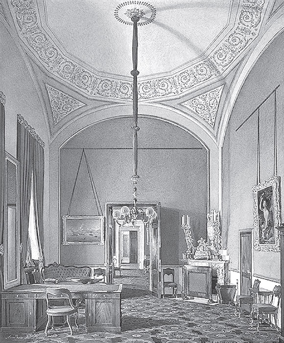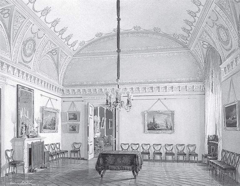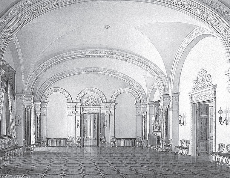 Ремонтировать покои Павла I в юго-восточной части Зимнего дворца начали в 1818 г., накануне приезда в Россию короля Пруссии Фридриха-Вильгельма III. Тогда предполагалось «возобновить без потери времени» комнаты, «начиная с половины Государыни Императрицы Марии Федоровны и до самого Эрмитажа по фасаду на плац». Курировал строительные работы министр финансов А. Гурьин, а ответственным за их выполнение назначили «коллежского советника Росси». Именно его «рисунки и назначения» определили все дизайнерские решения, реализованные в ходе ремонта[52].