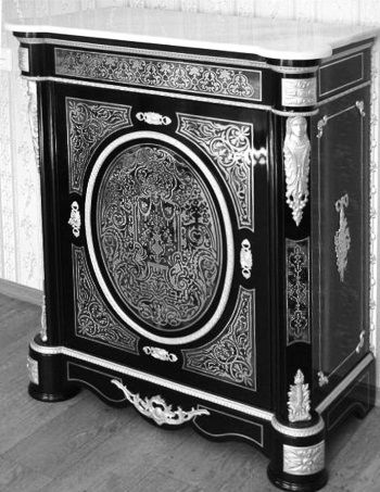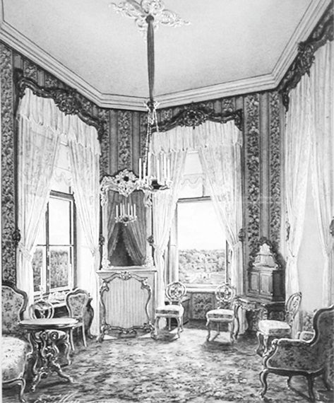 Пятая комната, очень большая, угловая, крыта красною с золотыми арабесками материею; большой письменный стол, с золотым письменным прибором, тут же стоял рояль и круглый прекрасный мозаичный стол… Эта комната называлась – парадный кабинет».